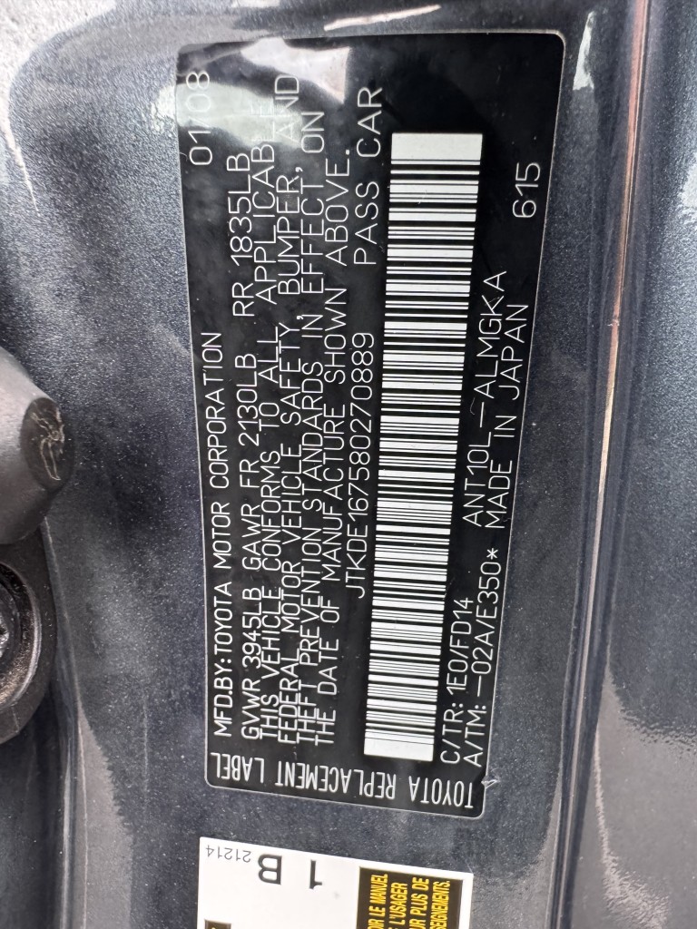 | VIN #: | JTKDE167580270889 |